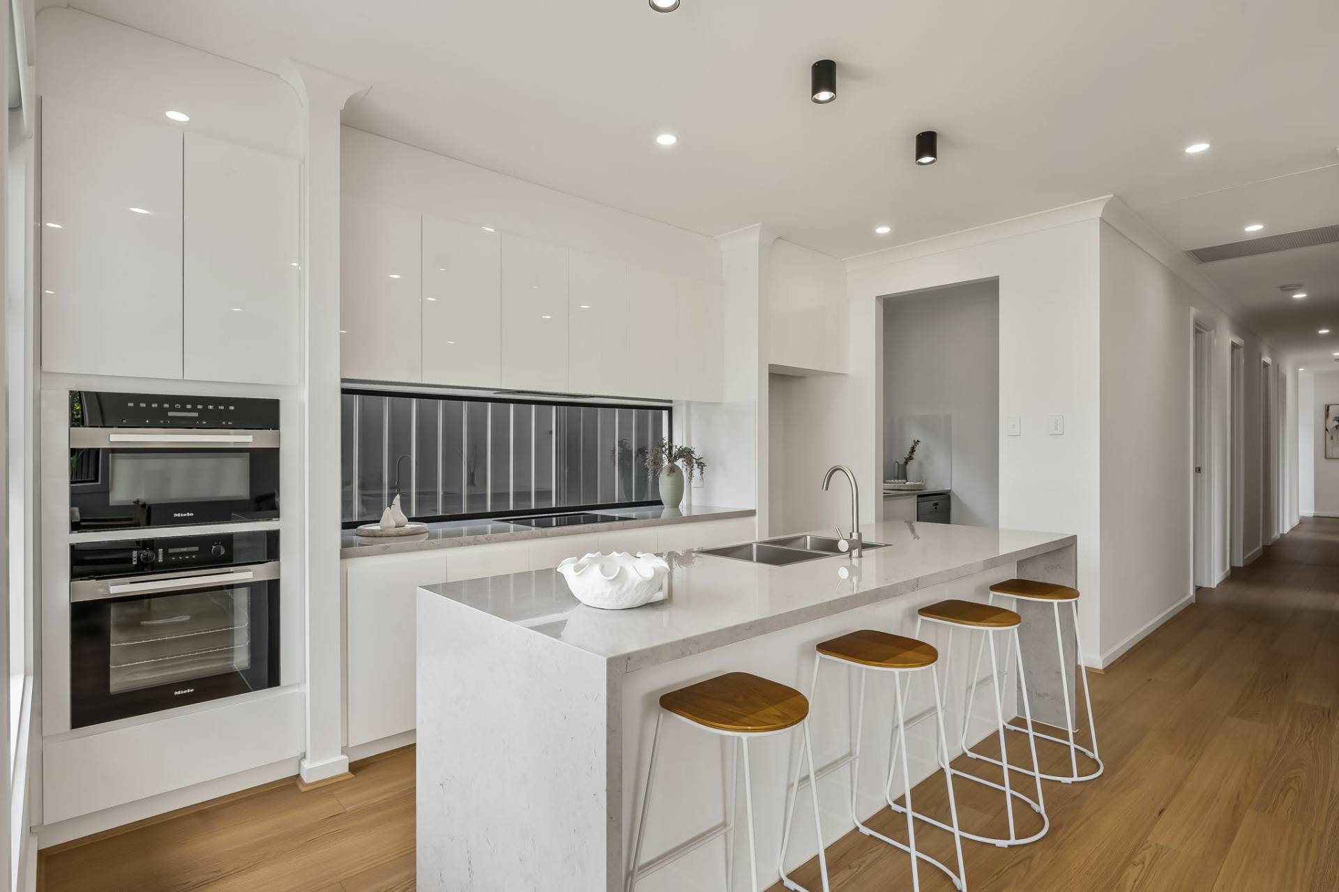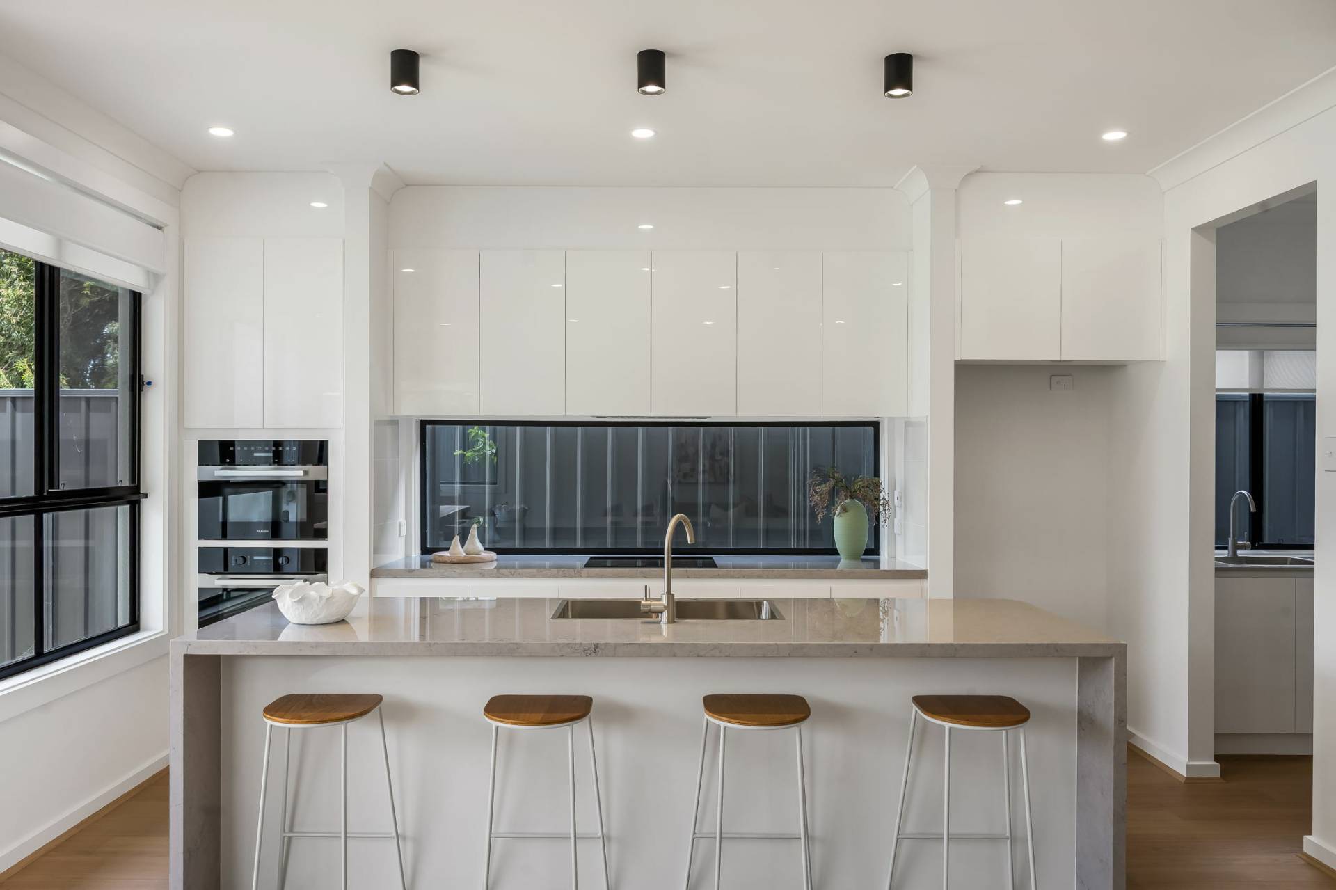 The contemporary kitchen is beautifully appointed with quality fixtures and finishes. Enjoy modern Miele appliances, ample bench space and a butlers pantry, and generous storage, everything you need to cook up a feast for family and friends. Whether it’s a casual breakfast or sunset drinks, this space will quickly become the hub of your home.