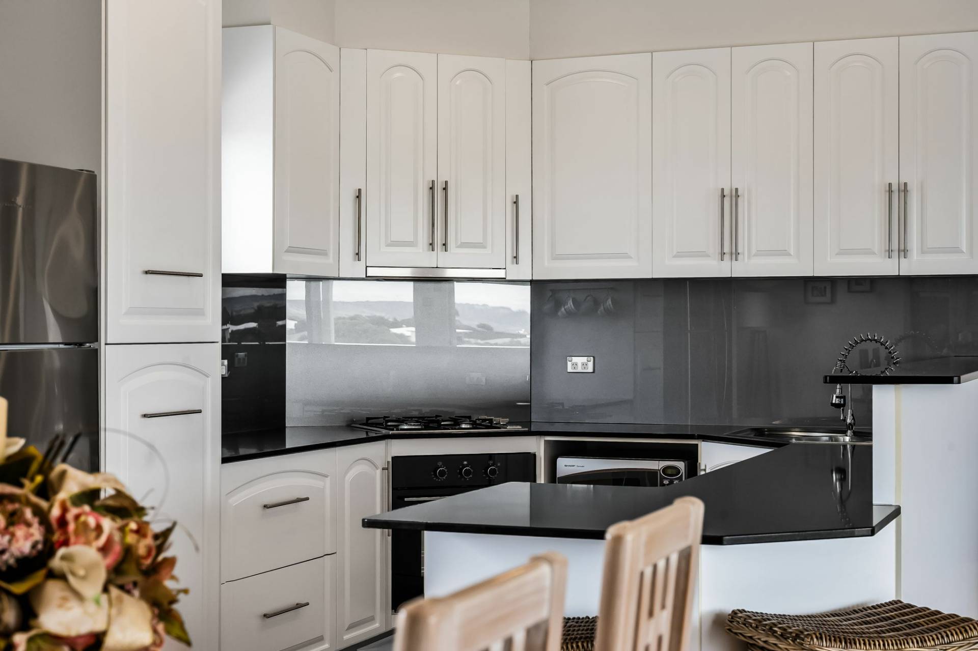 - Crisp modern contemporary kitchen featuring stone bench tops, abundant cabinetry + cupboards, gleaming appliances, including dishwasher
