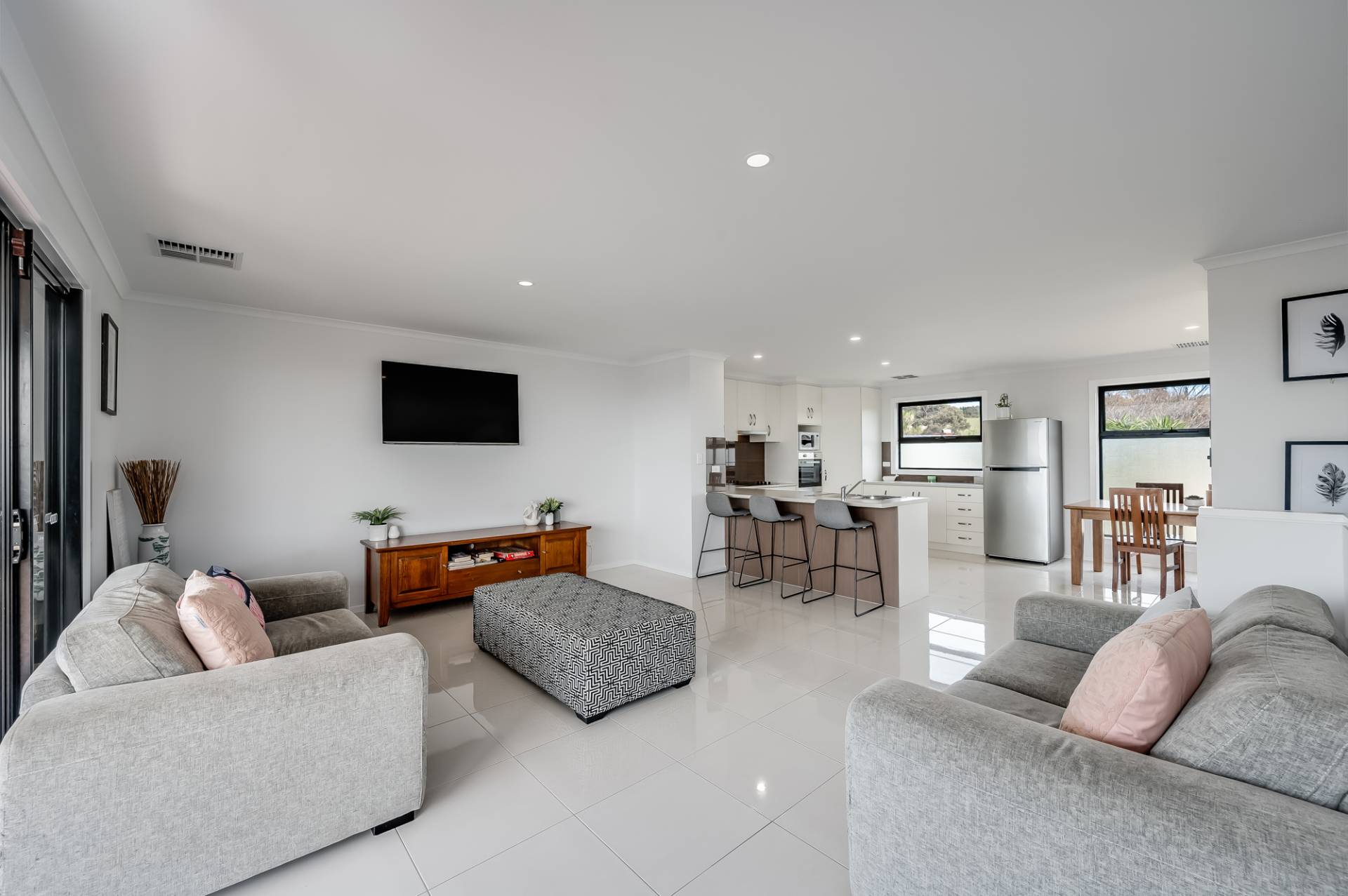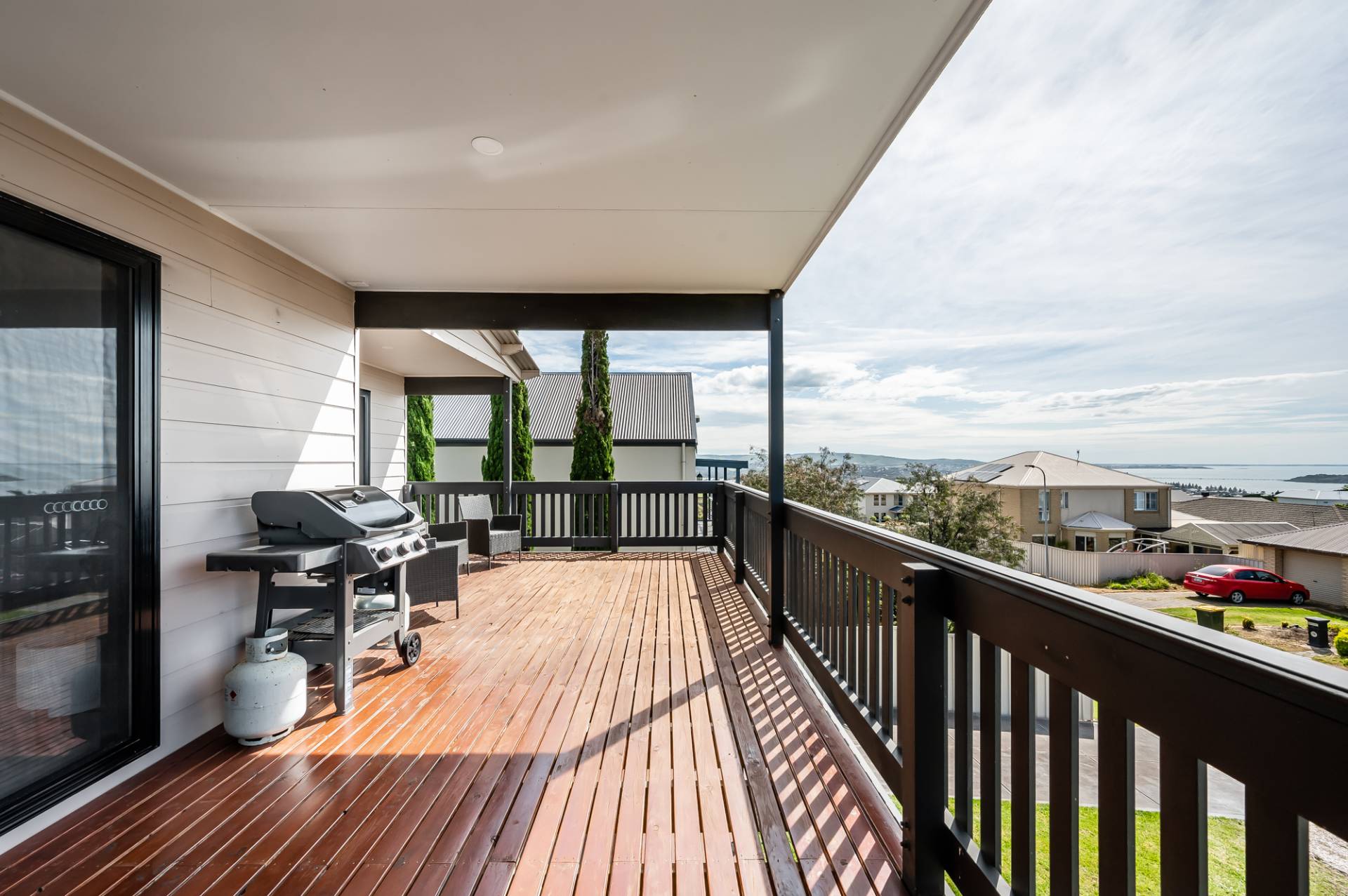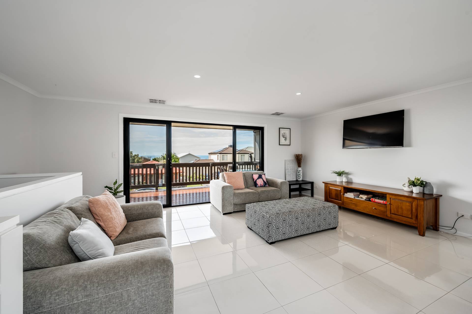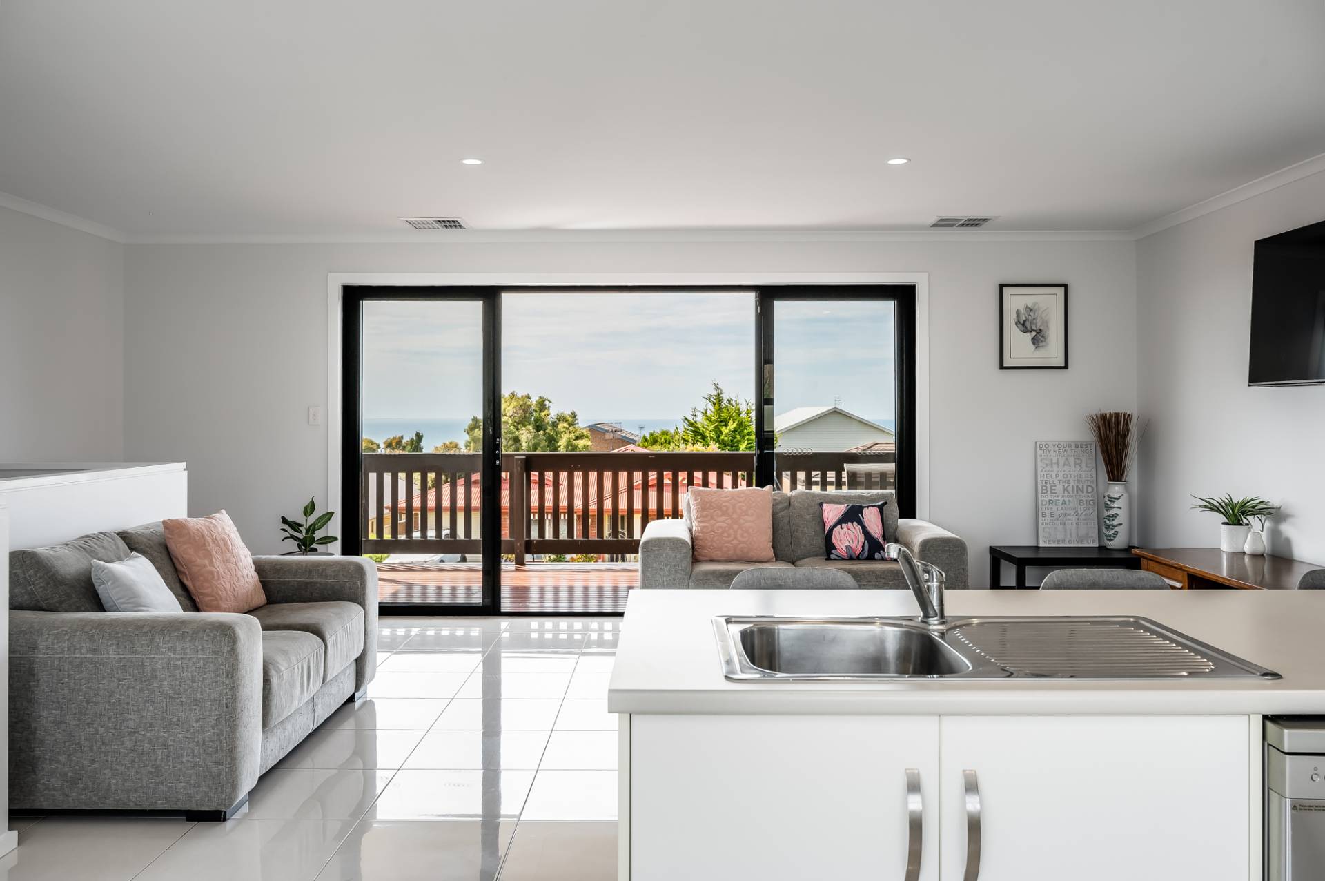 The upper level features an impressive open plan kitchen living and dining area with expansive sliding doors that open right out onto the large entertaining deck with views out to Granite Island and beyond. Why not bring the family and celebrate in style for Christmas and you can even watch the New year fireworks from the balcony.