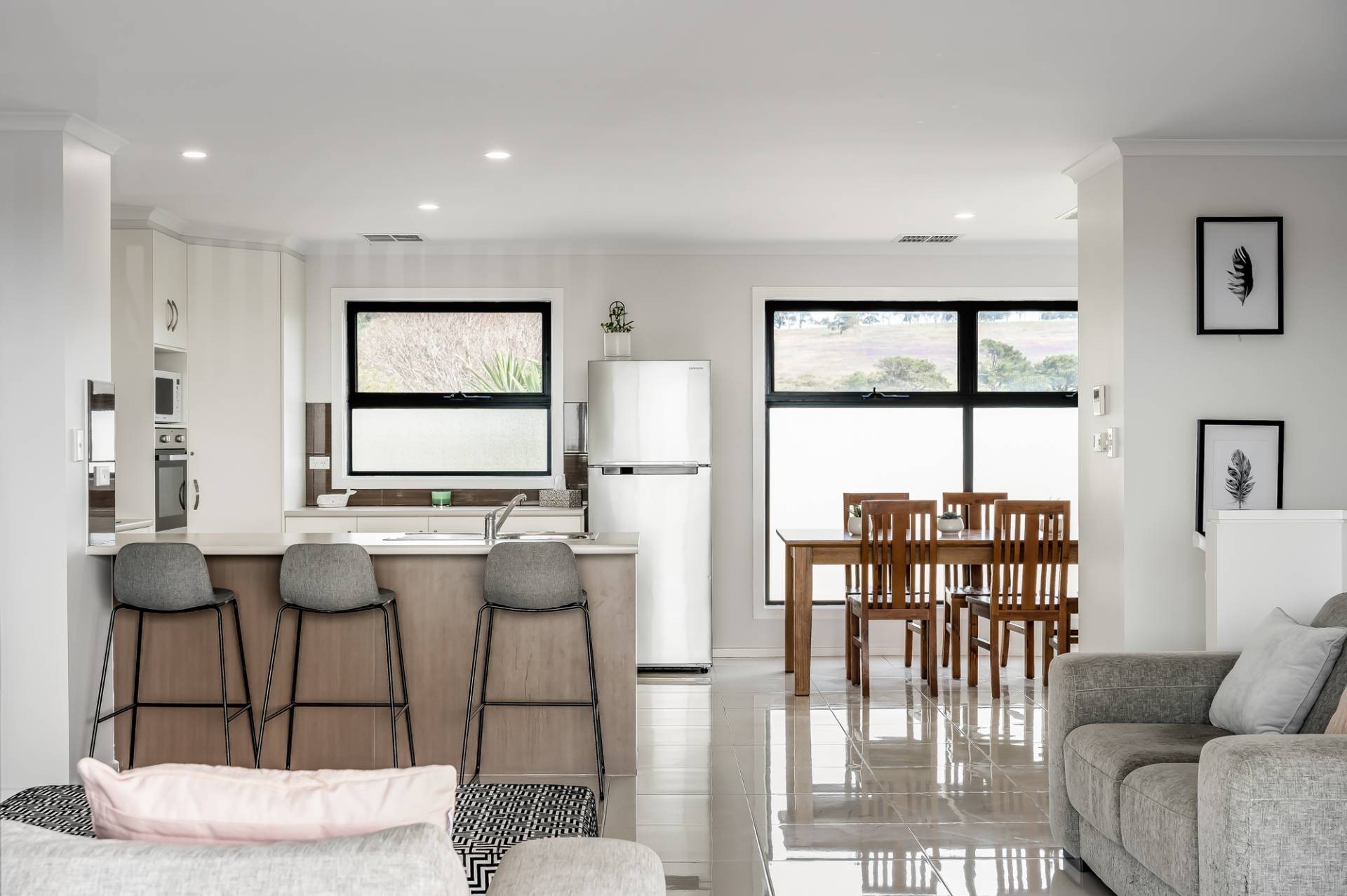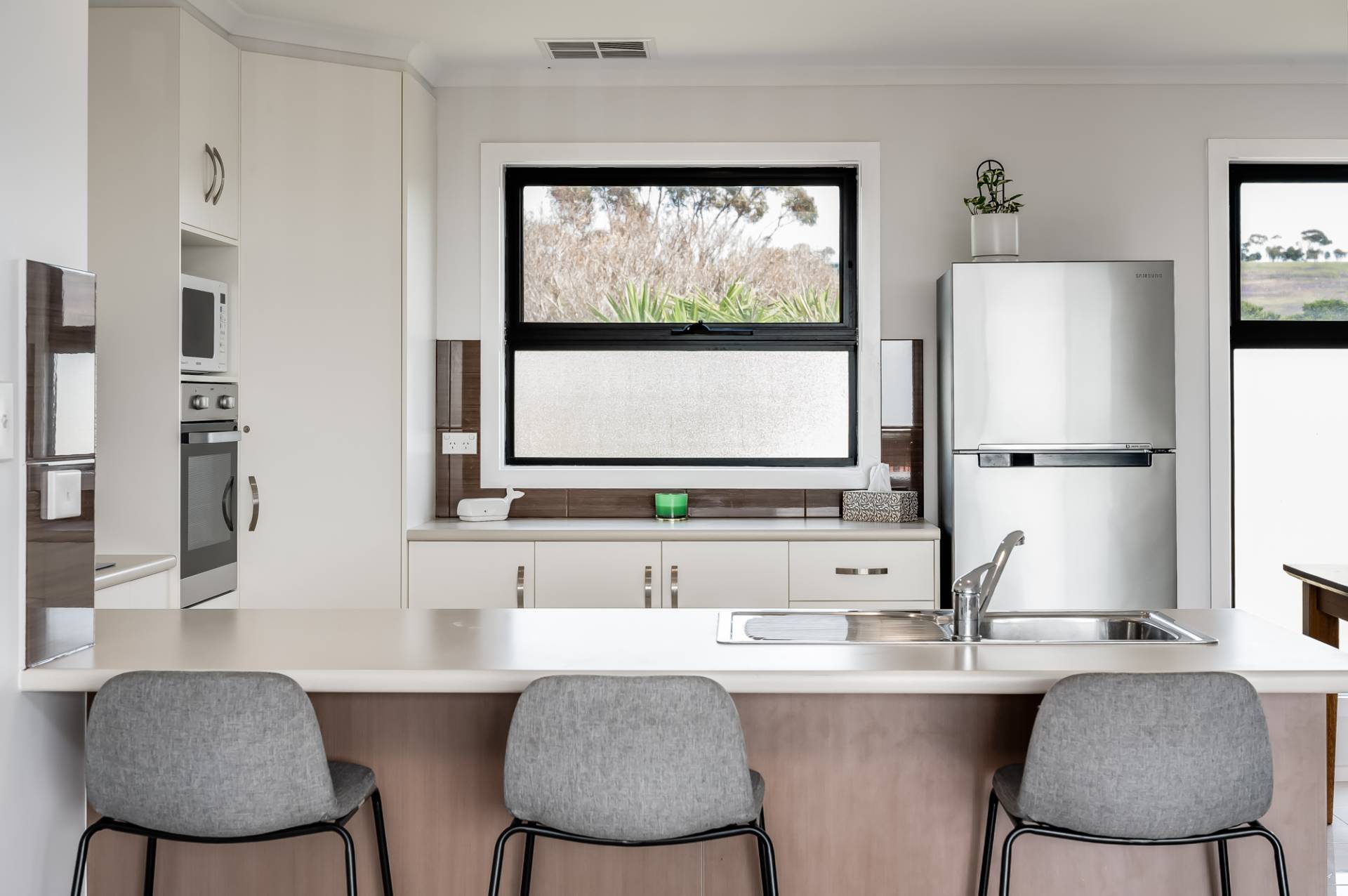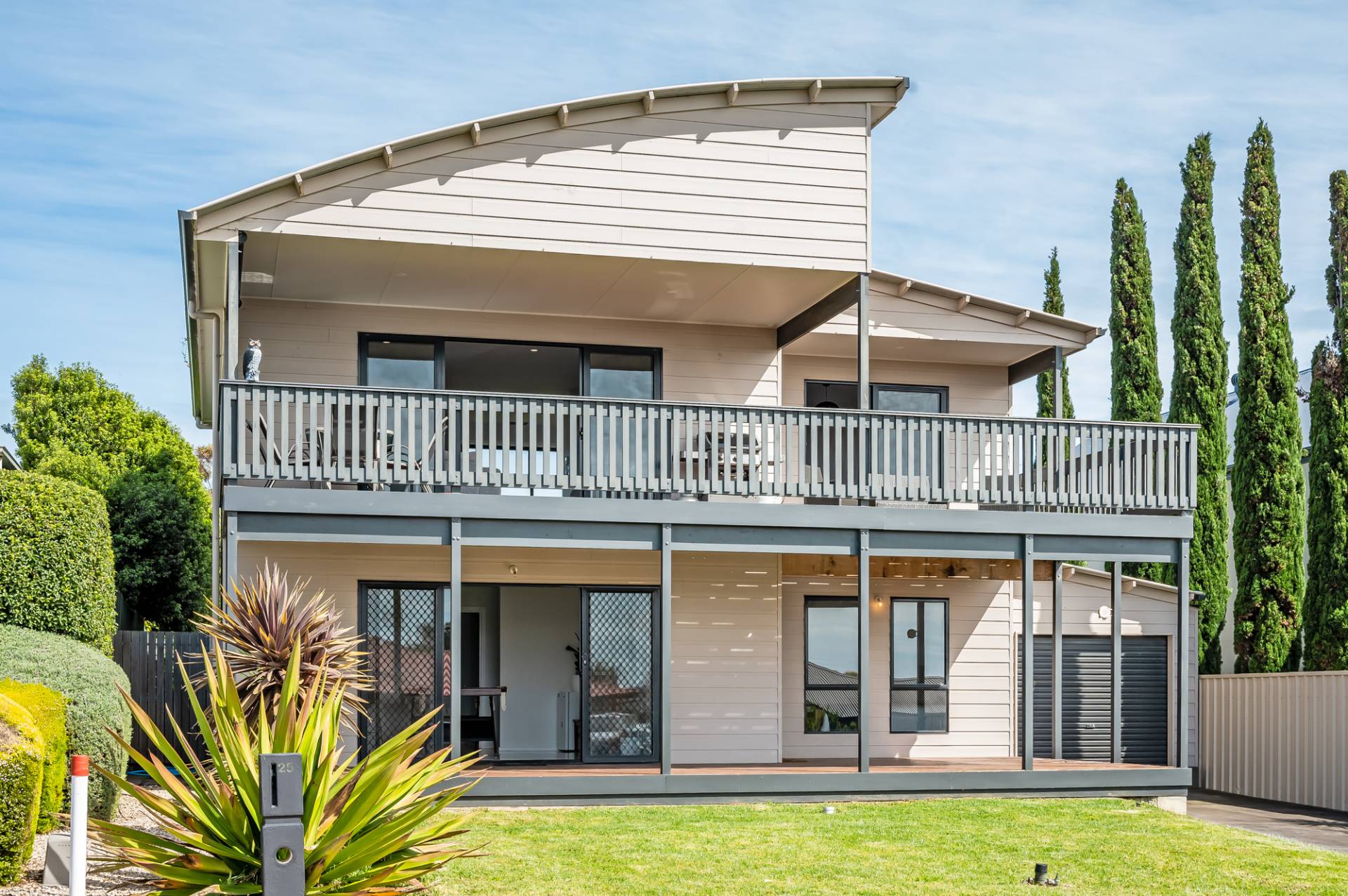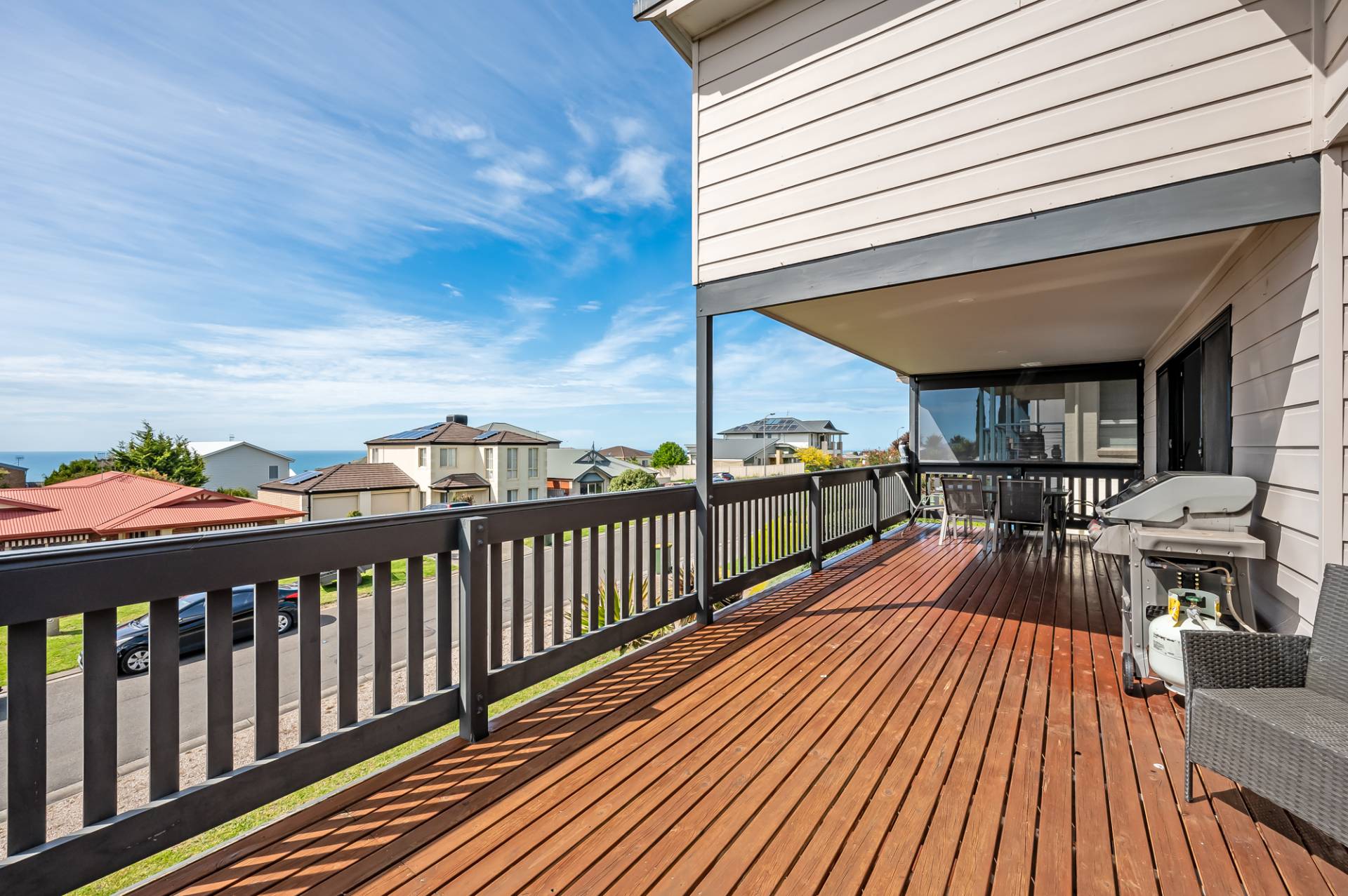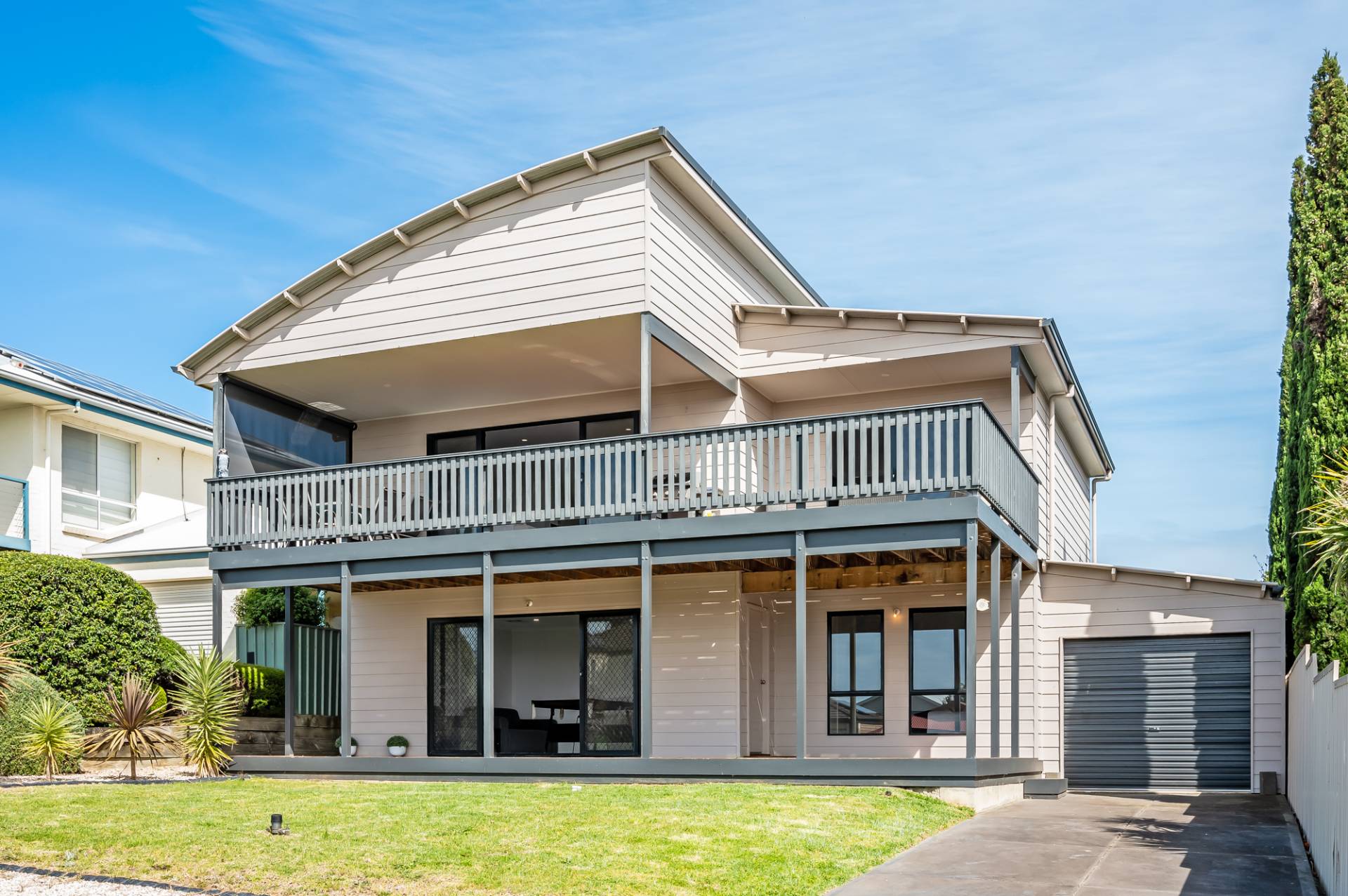 The upper level features an impressive open plan kitchen living and dining area with expansive sliding doors that open right out onto the large entertaining deck with views out to Granite Island and beyond. Why not bring the family and celebrate in style for Christmas and you can even watch the New year fireworks from the balcony.