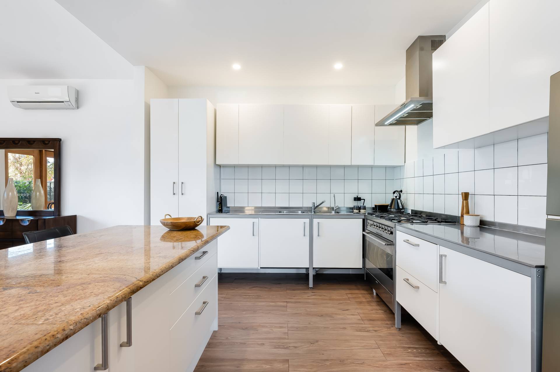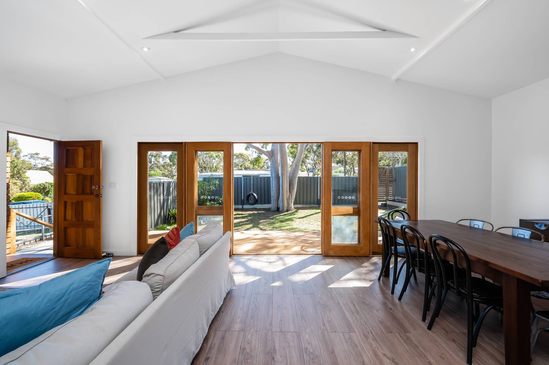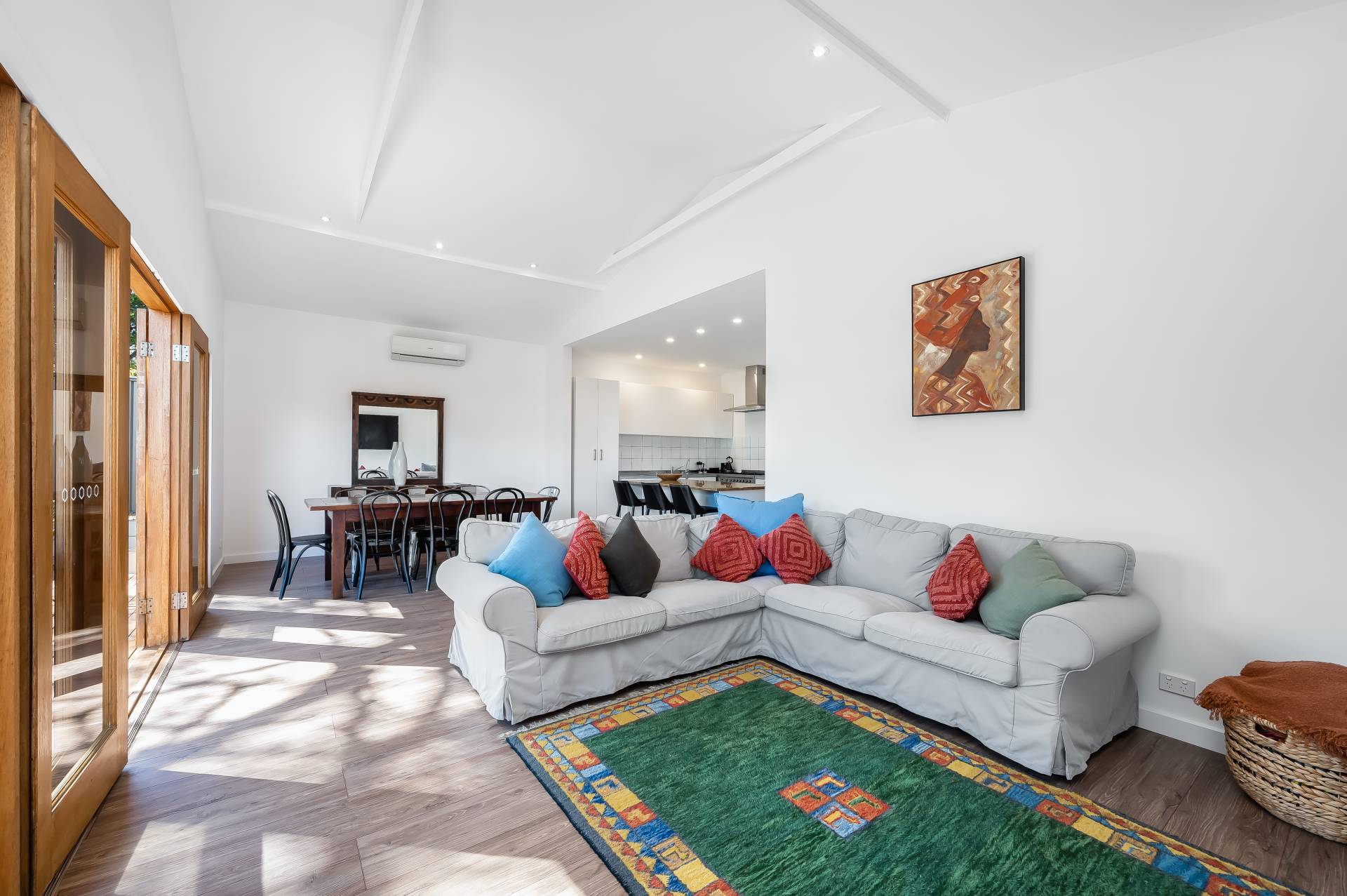 The home underwent a full internal renovation earlier this year. The photos speak for themselves. The well-proportioned living-dine-kitchen at the front of the house features raked ceilings and access through French doors to a spacious deck, which is perfect for entertaining and family meals. The front yard is enclosed in a courtyard style and features a large, truly spectacular gum tree. The kitchen is commercial style featuring stainless steel appliances, gas cook top and breakfast bar. All in all, the living area has a lovely casual feel.