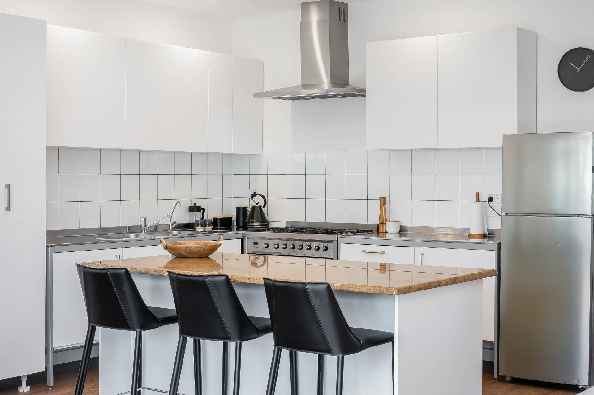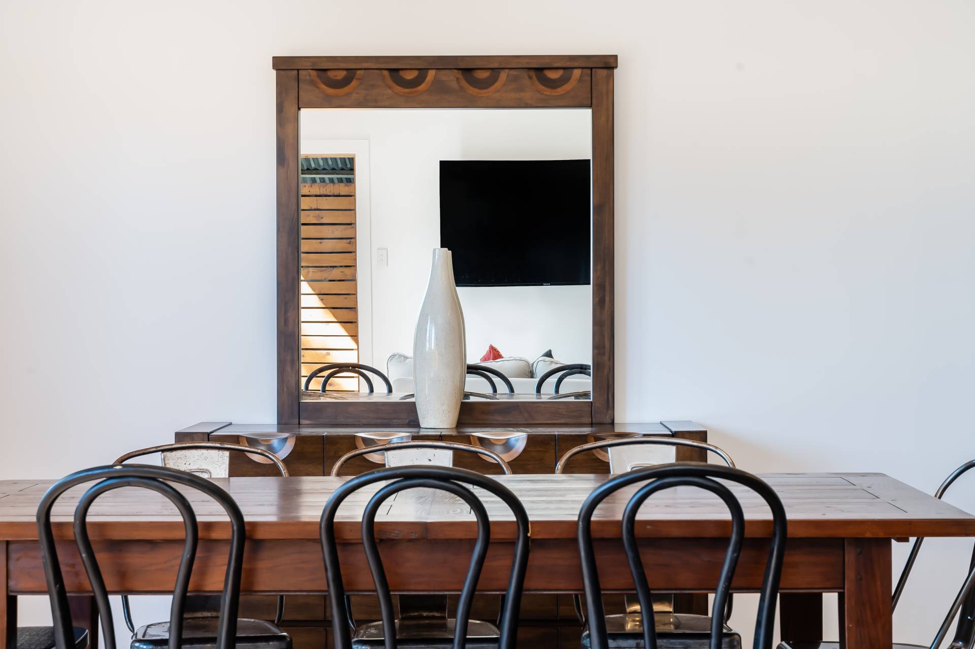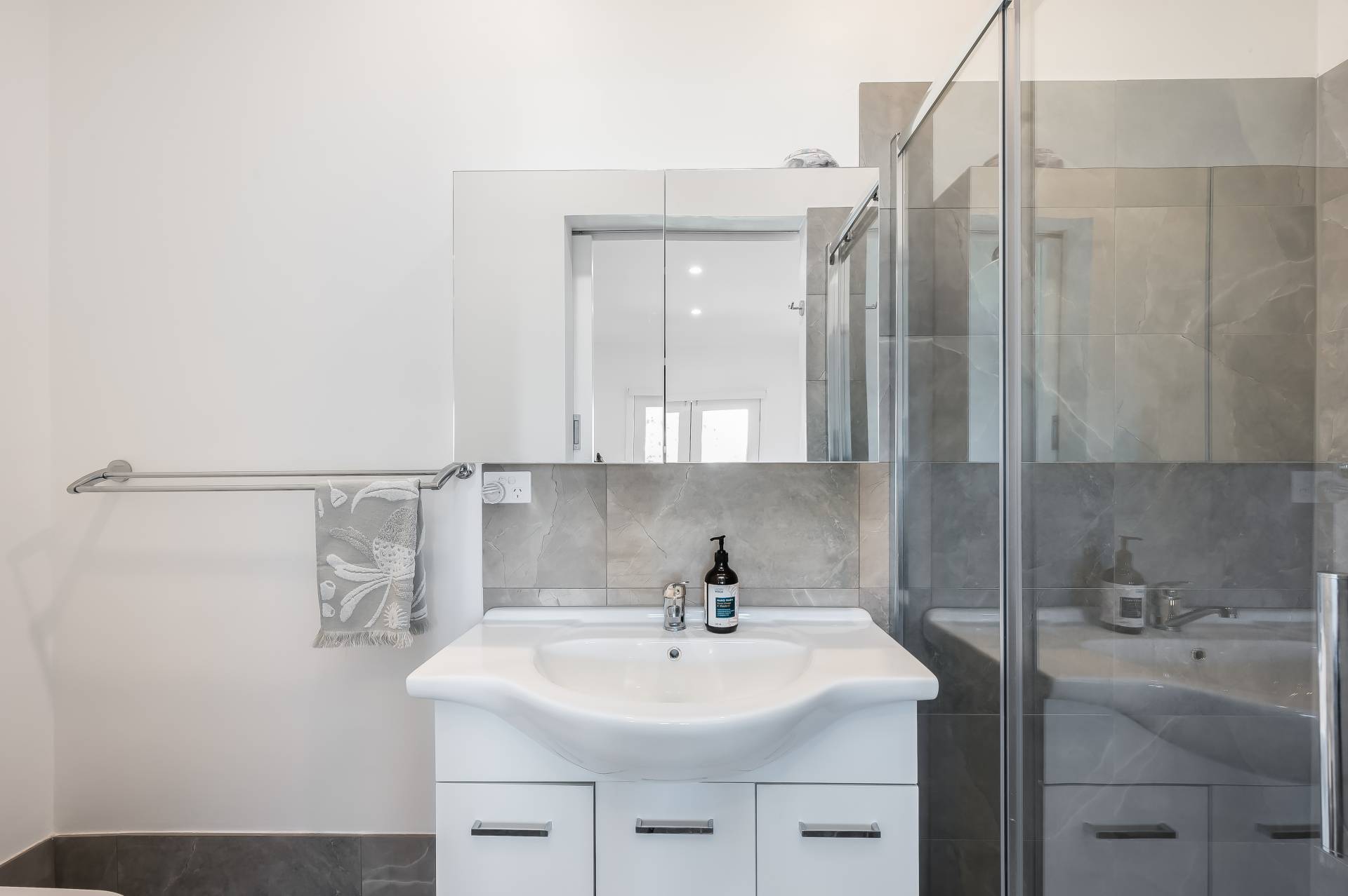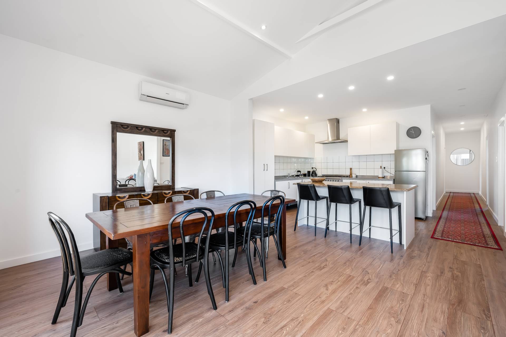 The home underwent a full internal renovation earlier this year. The photos speak for themselves. The well-proportioned living-dine-kitchen at the front of the house features raked ceilings and access through French doors to a spacious deck, which is perfect for entertaining and family meals. The front yard is enclosed in a courtyard style and features a large, truly spectacular gum tree. The kitchen is commercial style featuring stainless steel appliances, gas cook top and breakfast bar. All in all, the living area has a lovely casual feel.