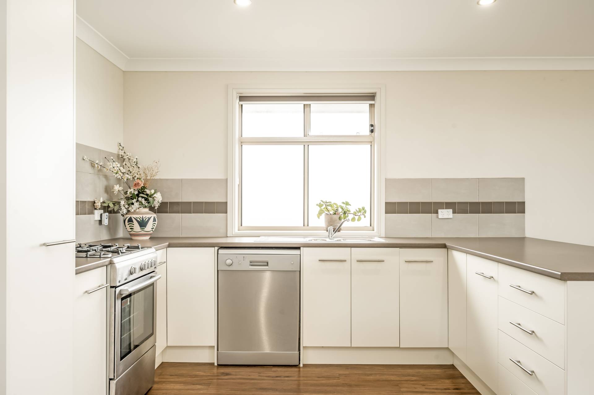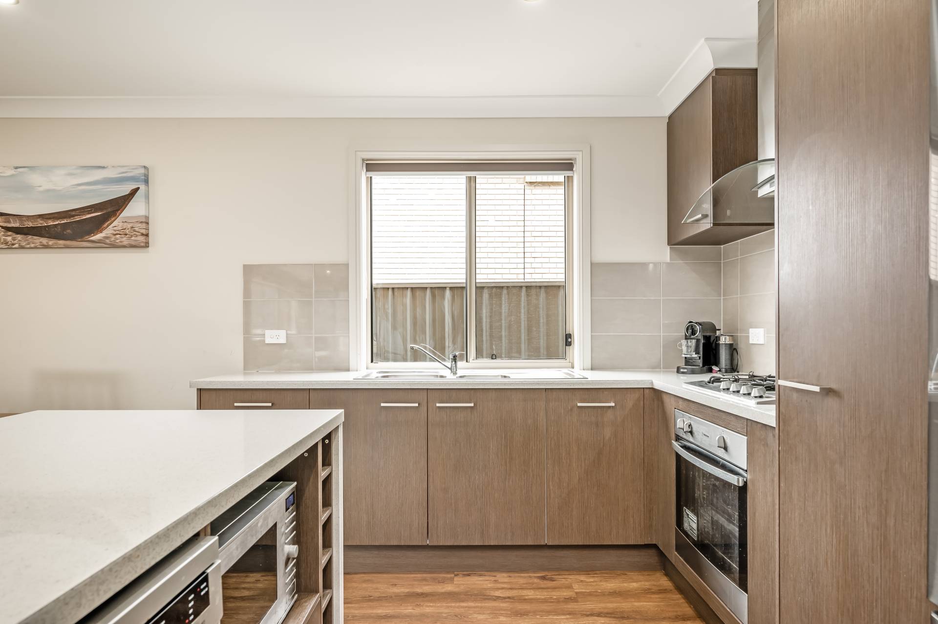 - Cosy open-plan ground floor featuring designer kitchen flush with sleek cabinetry and cupboards, spacious island, dual sinks and gleaming stainless appliances