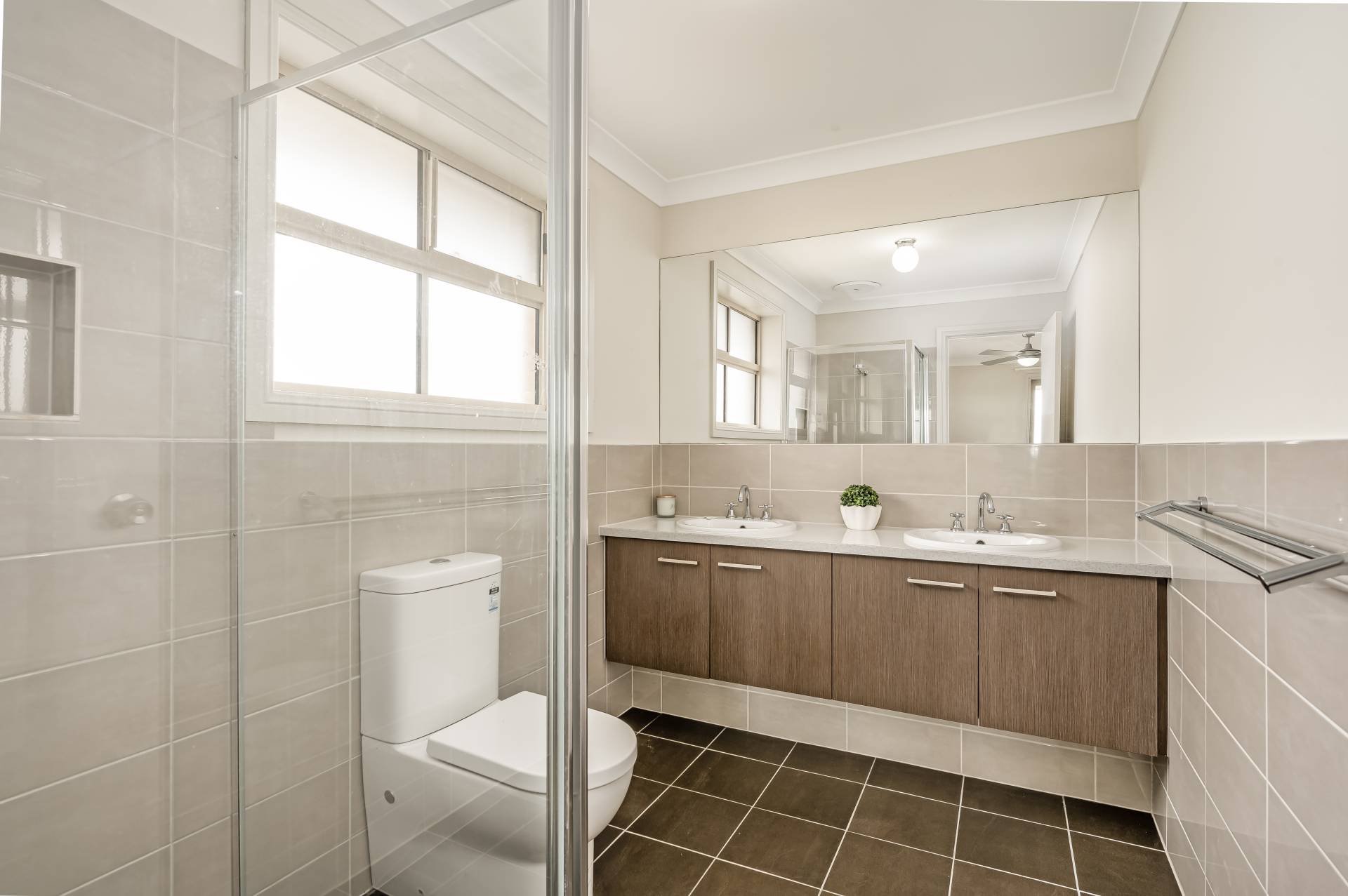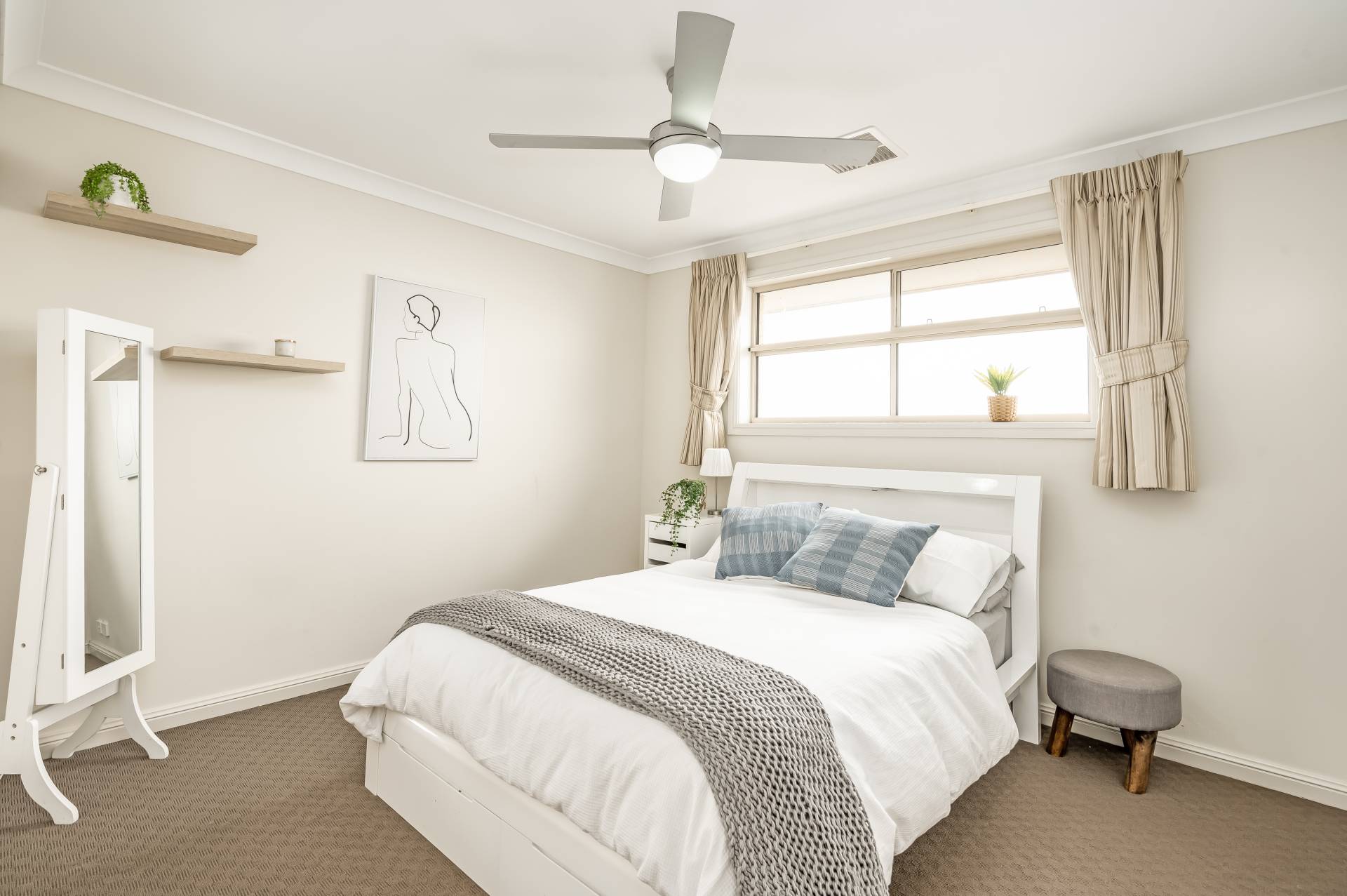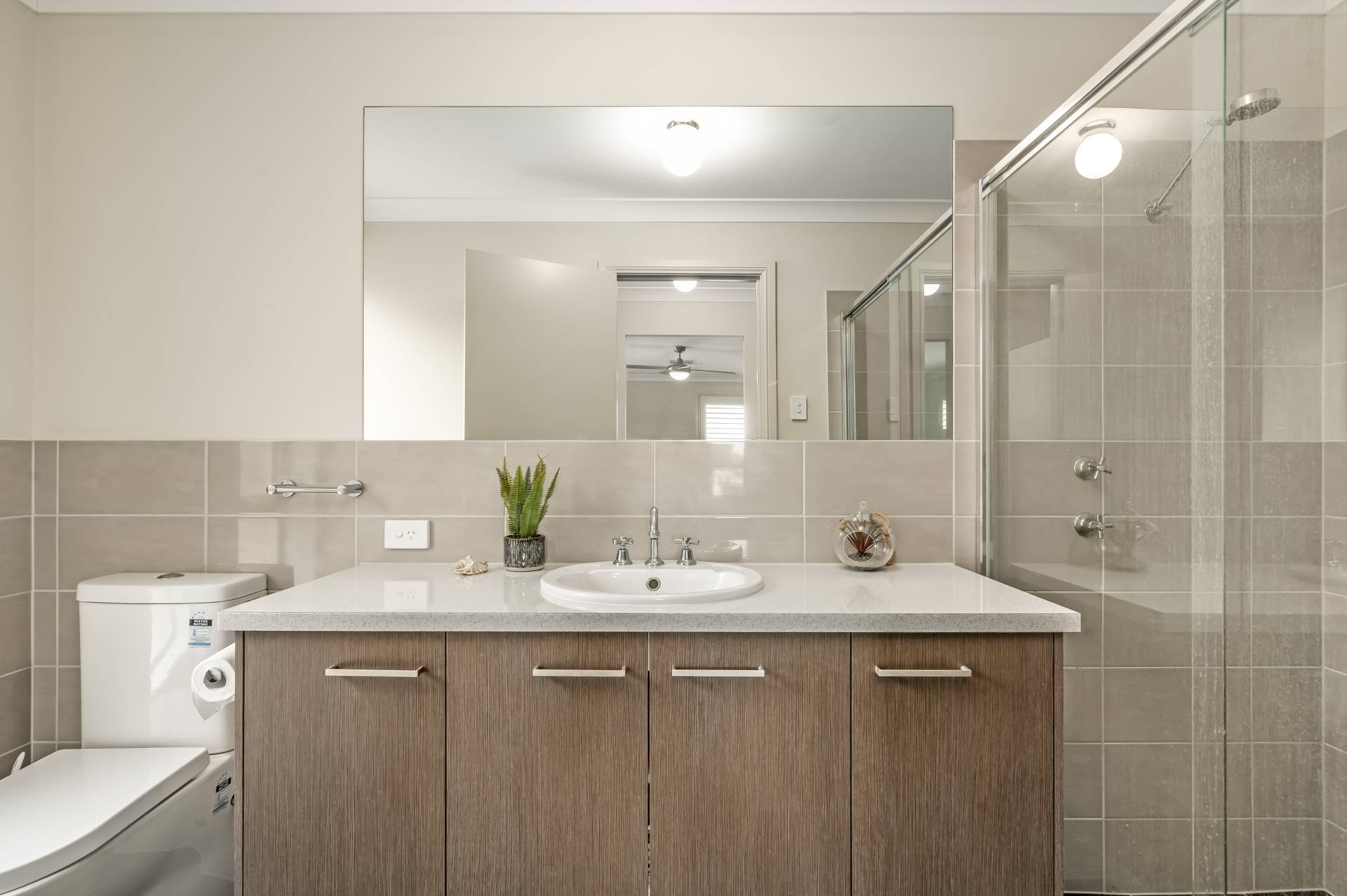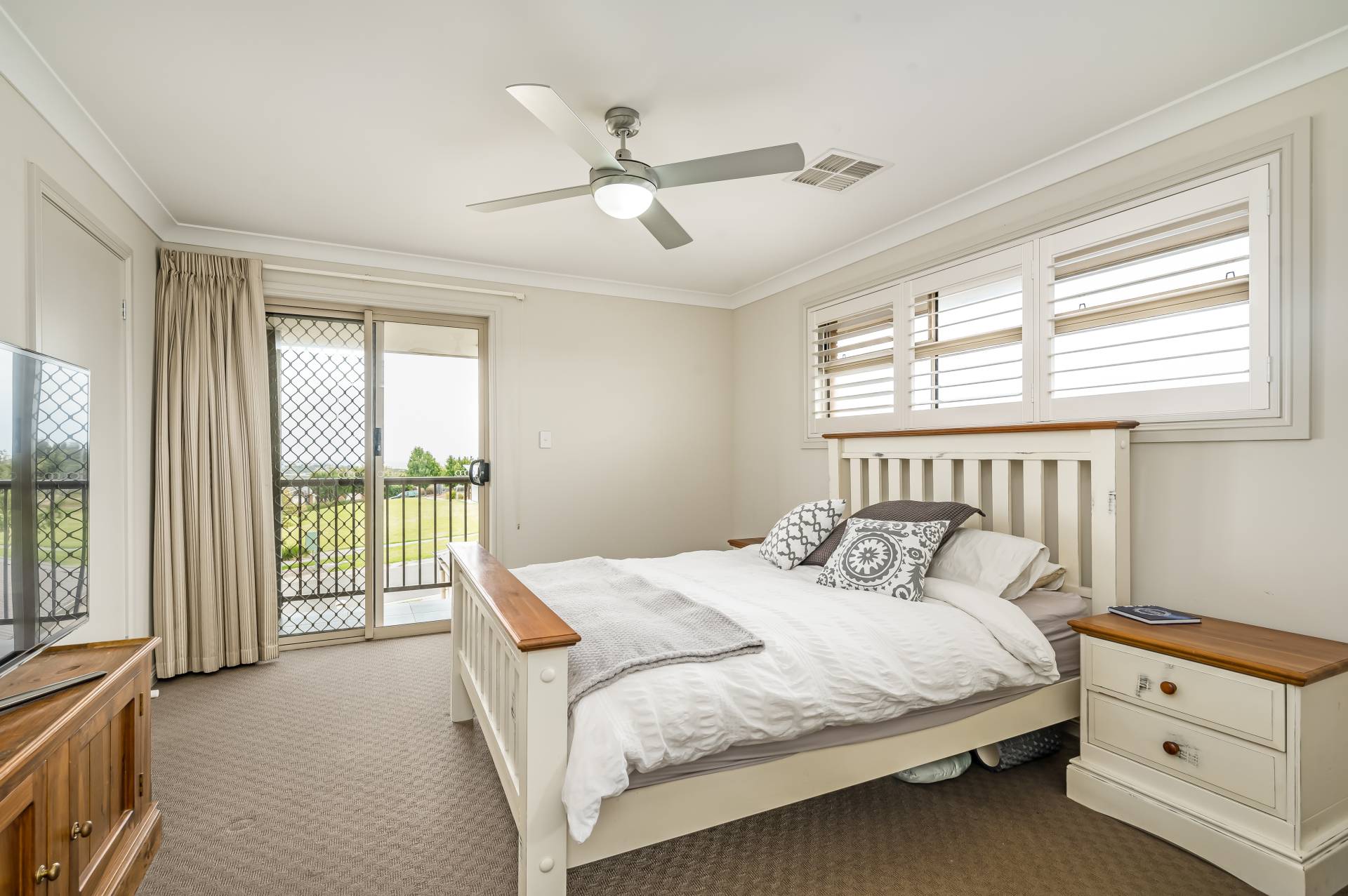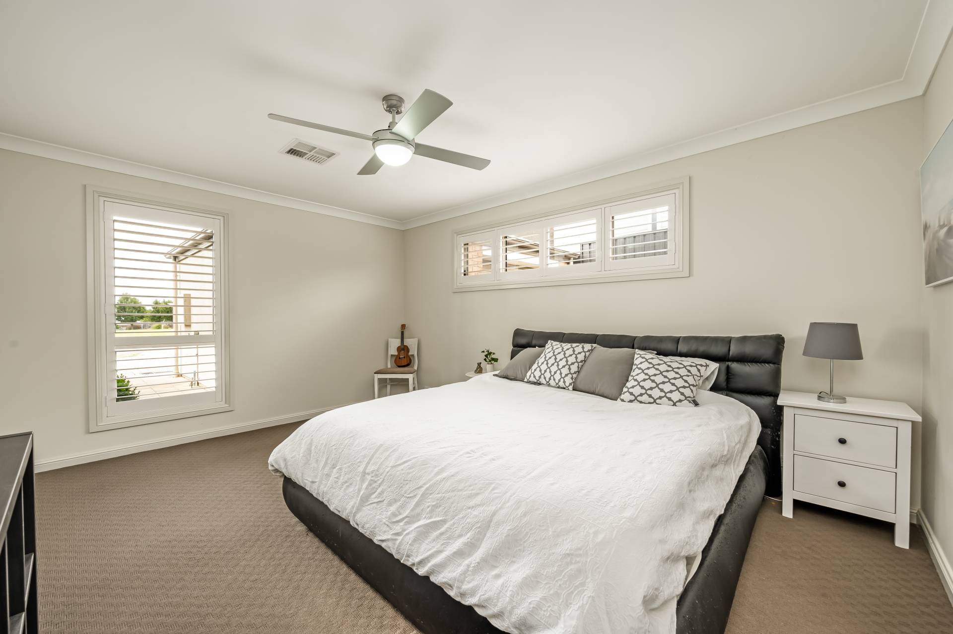 - Ground floor master bedroom featuring plantation shutters, ceiling fan, WIR and ensuite as well as guest bedroom also with plantations, ceiling fan, BIRs and ensuite access to main bathroom