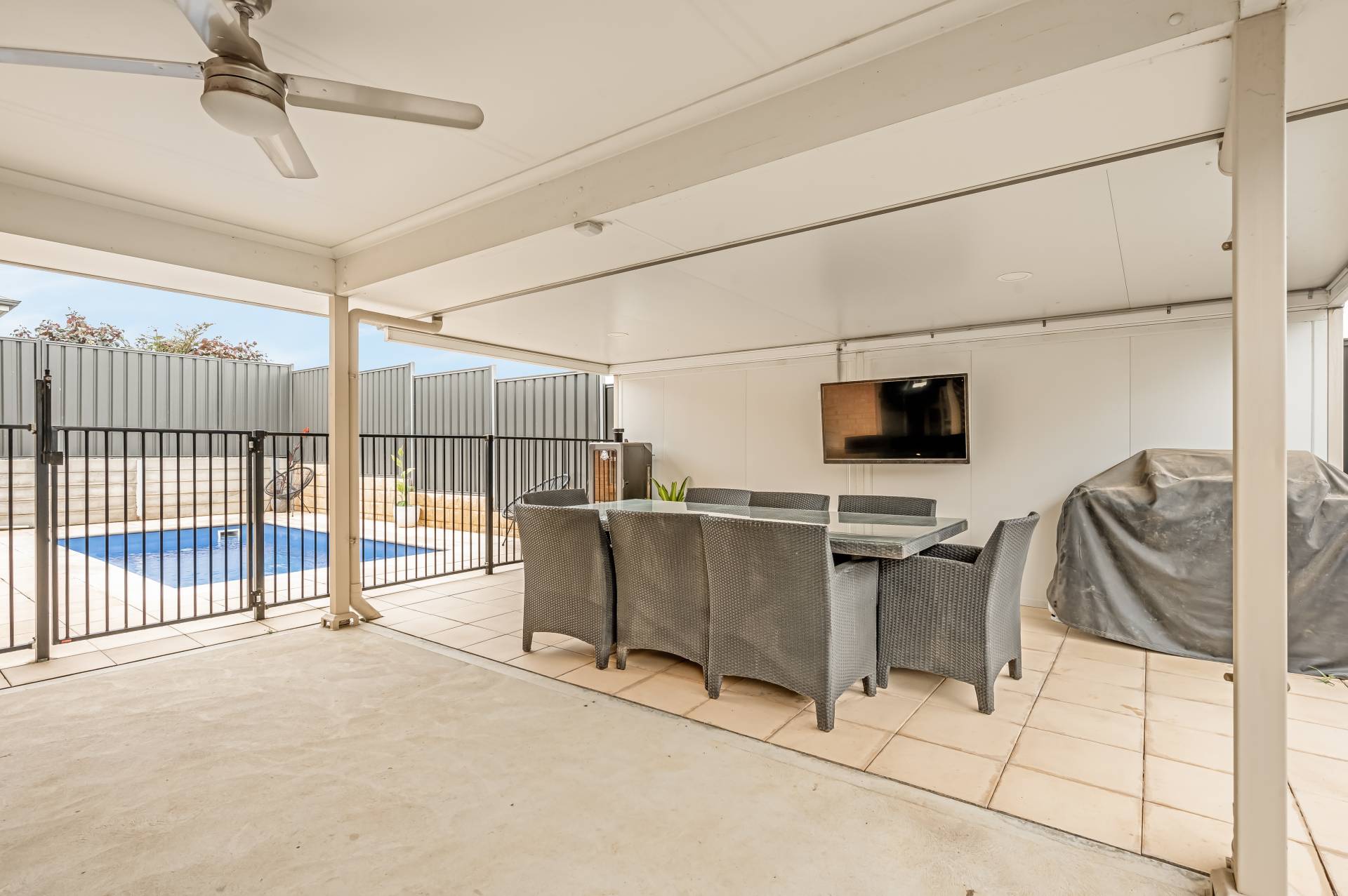 - All-weather outdoor entertaining area with ceiling fan and TV provision for perfect summer barbeques and balmy twilight evenings