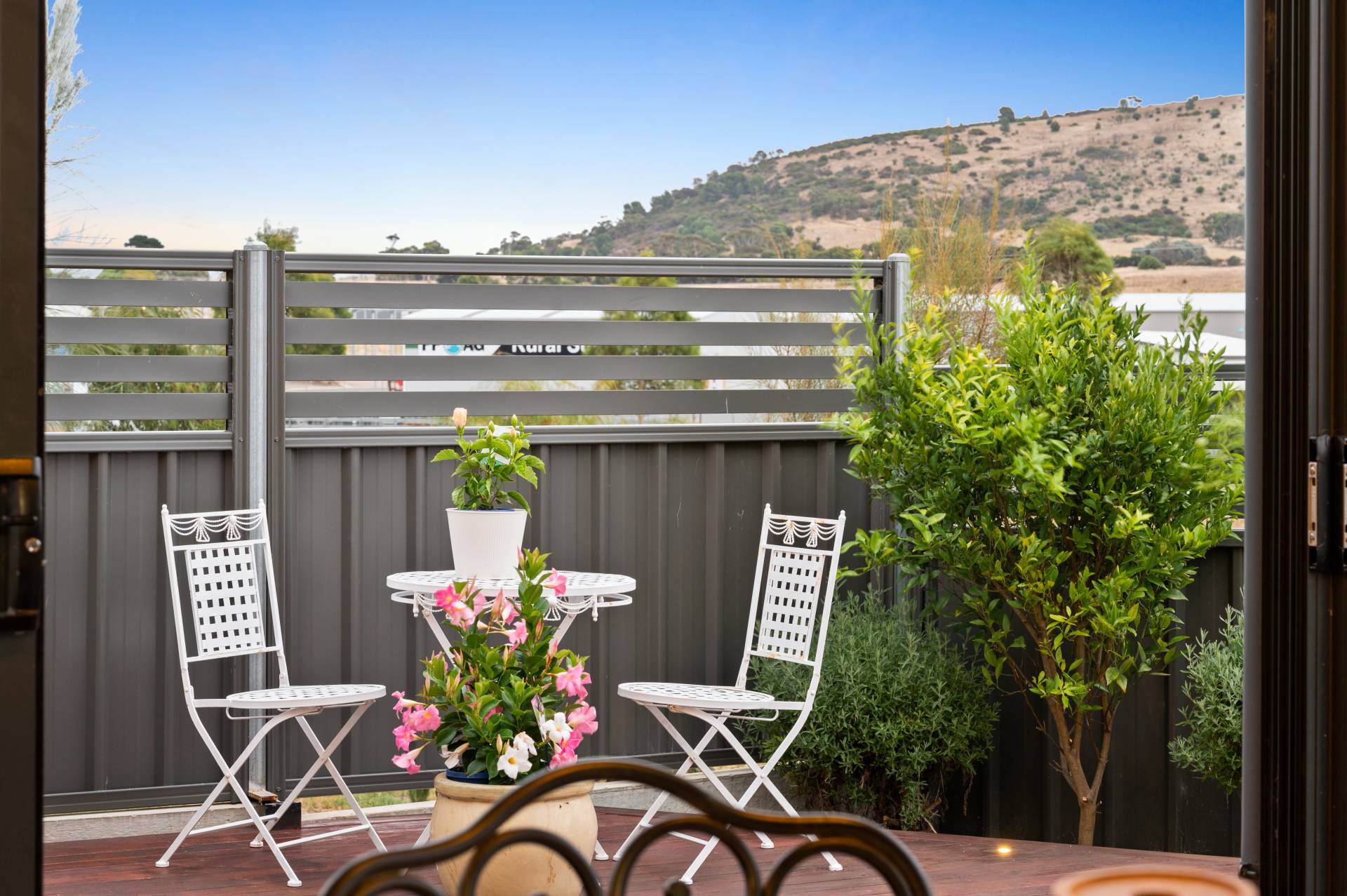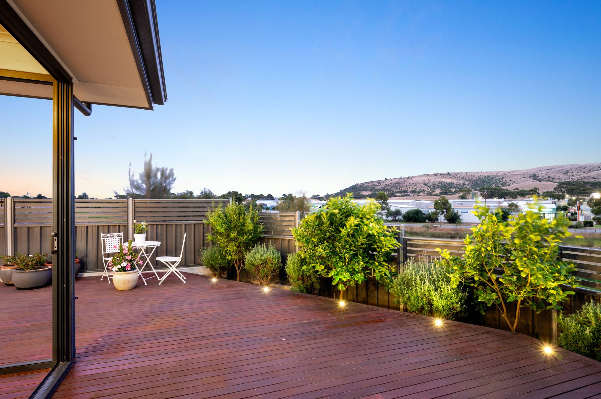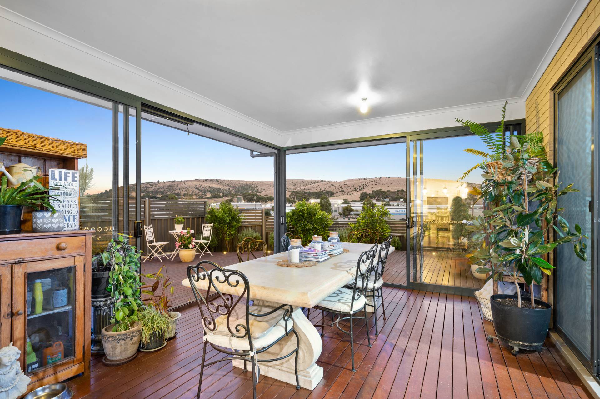 - Sunny backyard timber decking overlooking scenic rolling hills, neat lawn area and sizable storage shed.