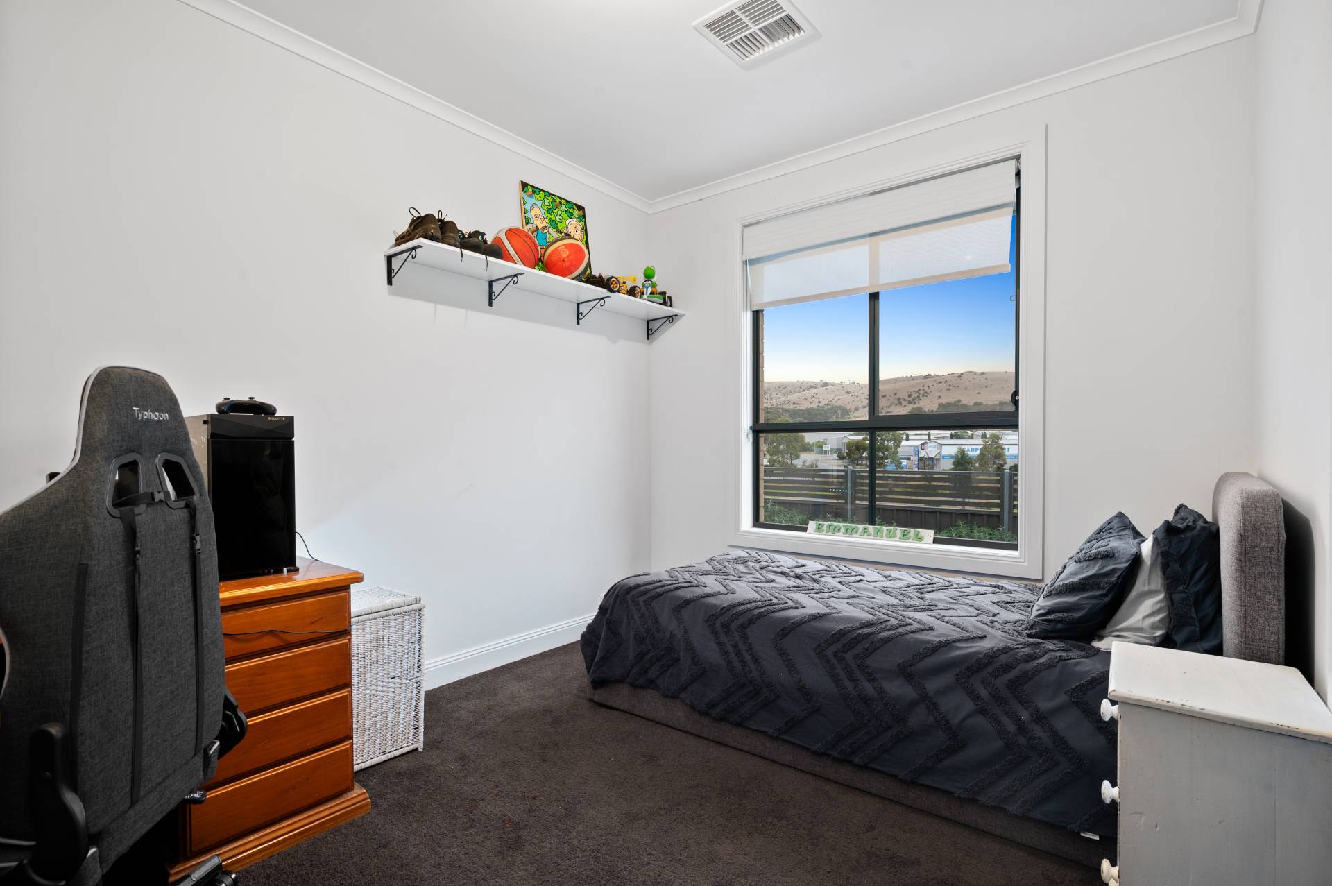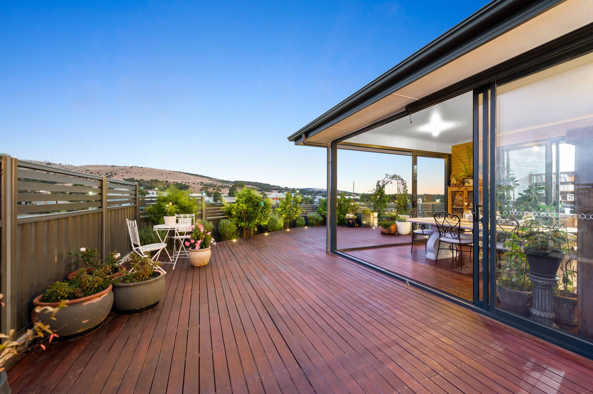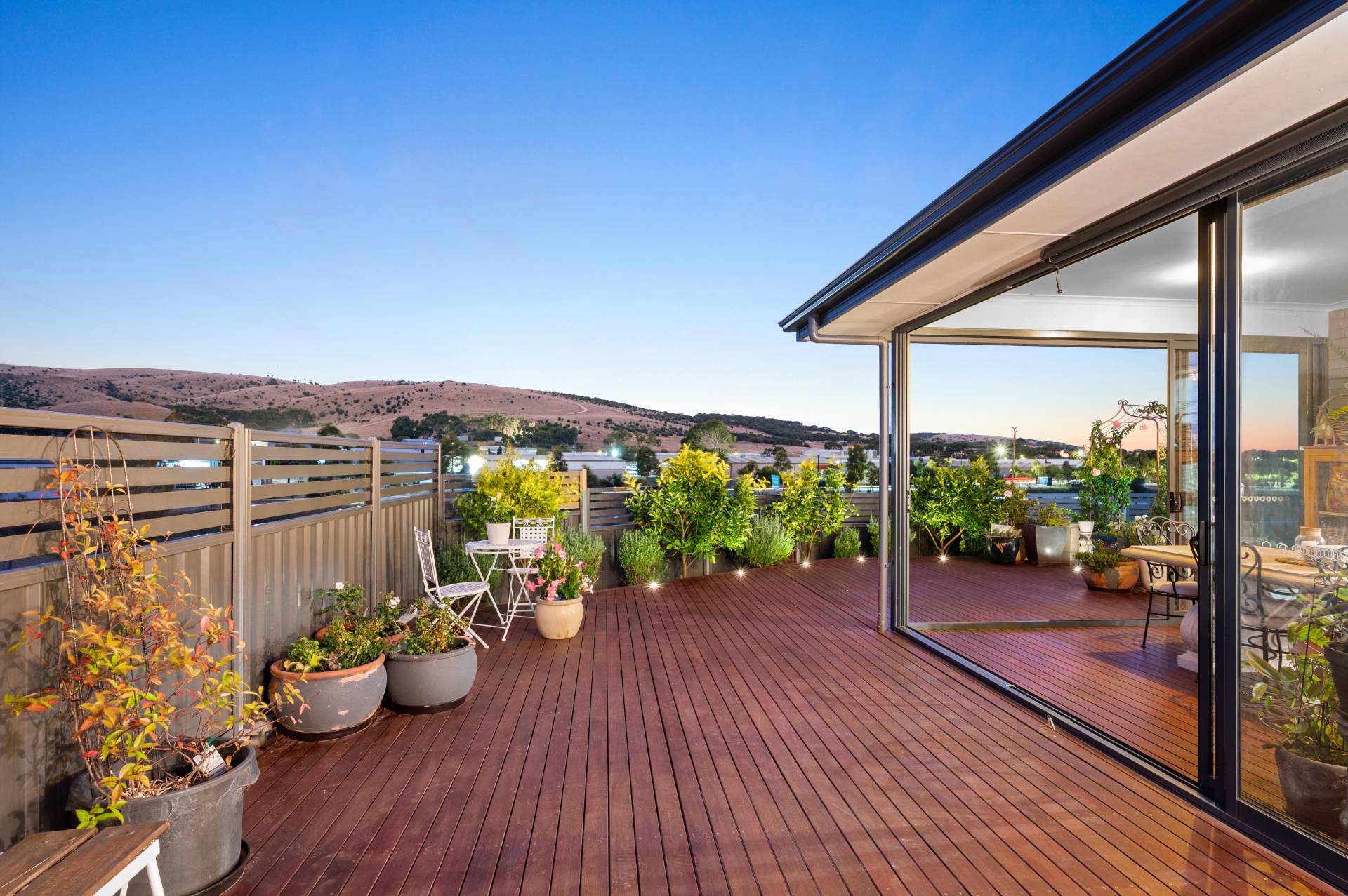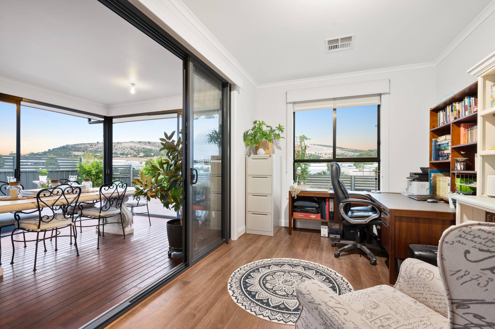 - Sunny backyard timber decking overlooking scenic rolling hills, neat lawn area and sizable storage shed.