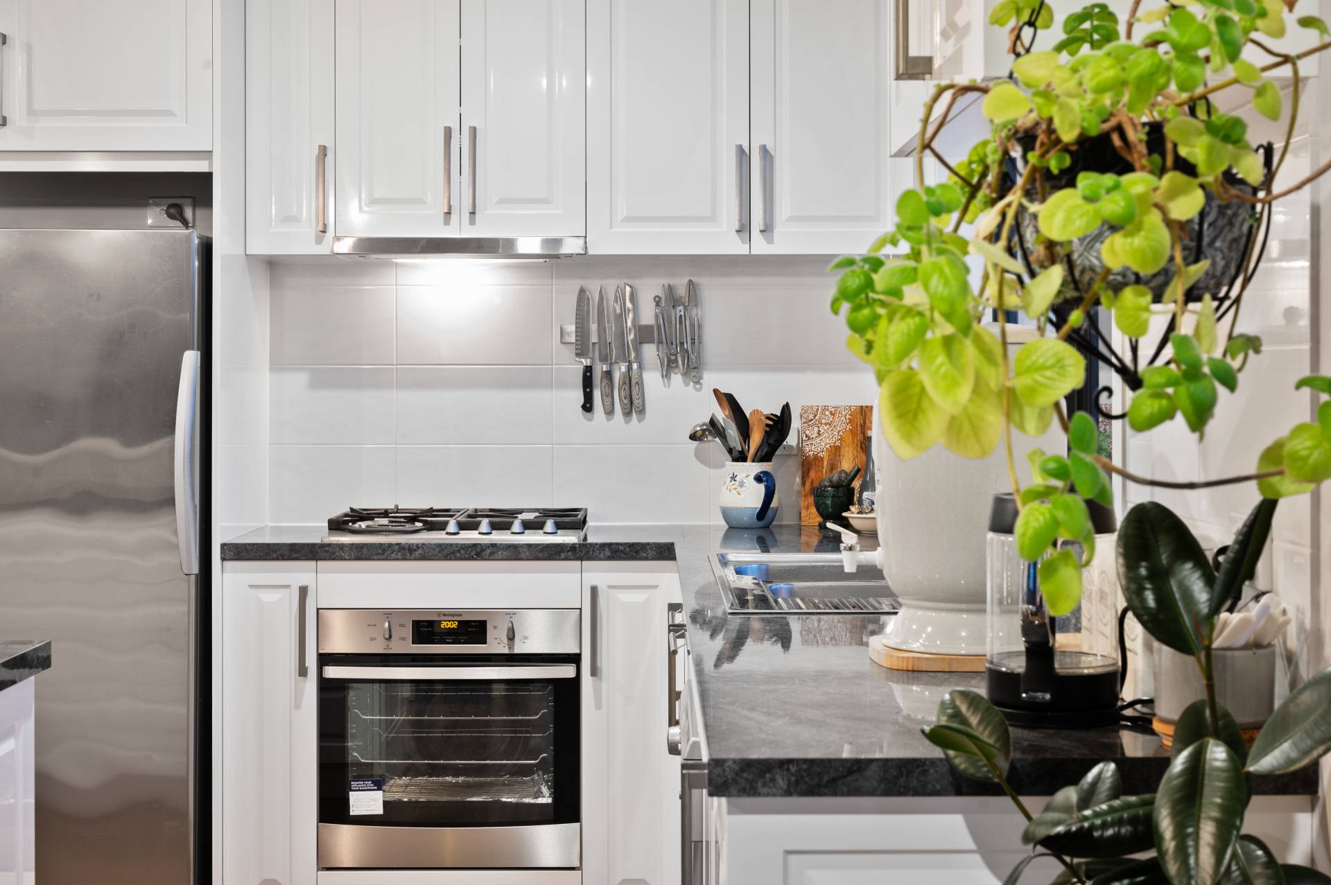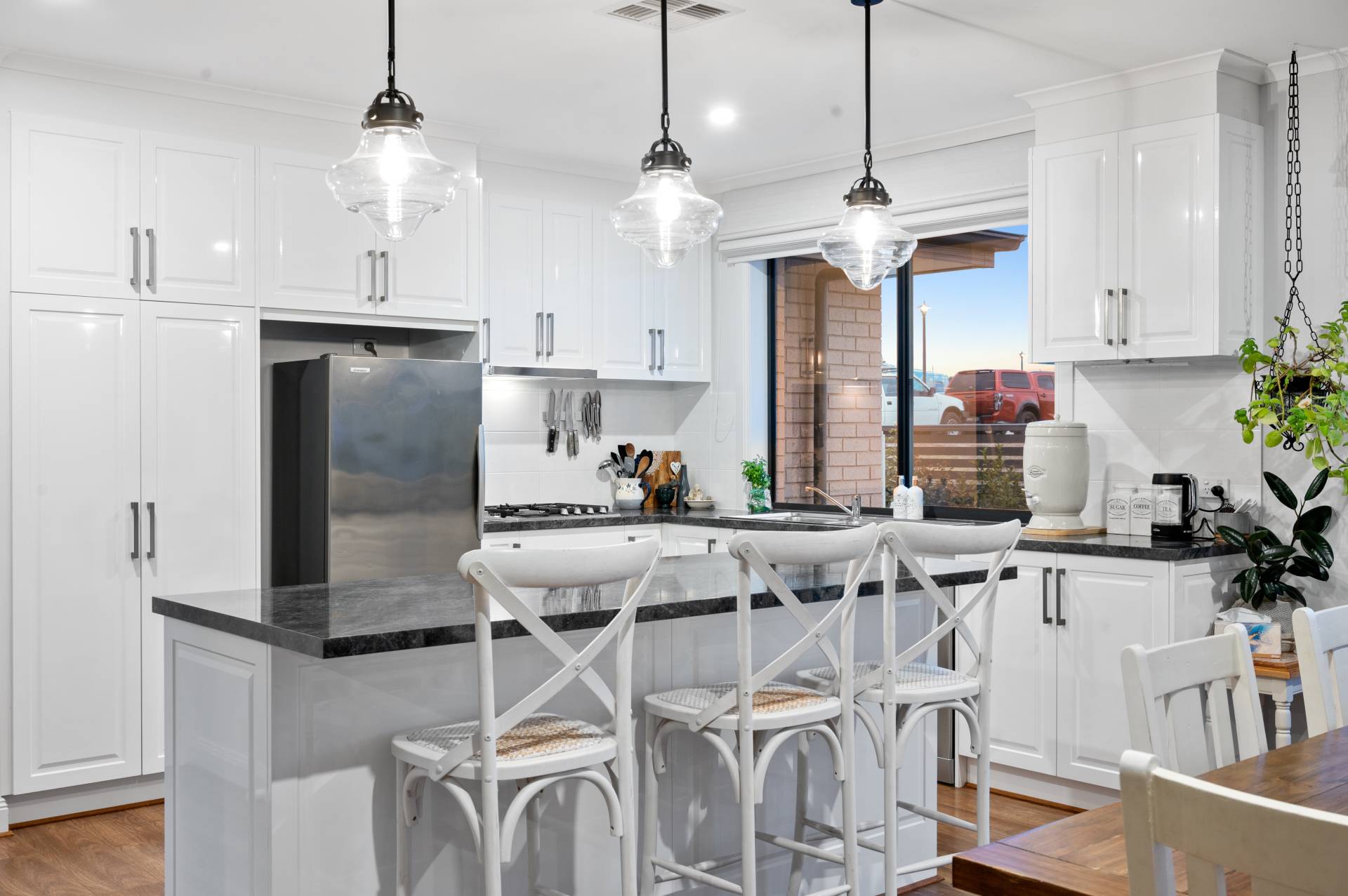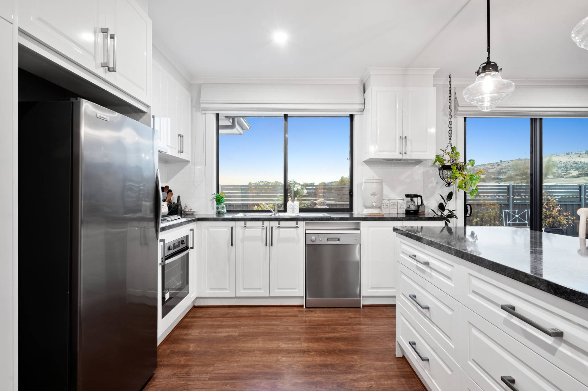 - Modern kitchen with stone bench tops and breakfast bar, elegant cabinetry and cupboards, pendant lighting, and gleaming stainless appliances