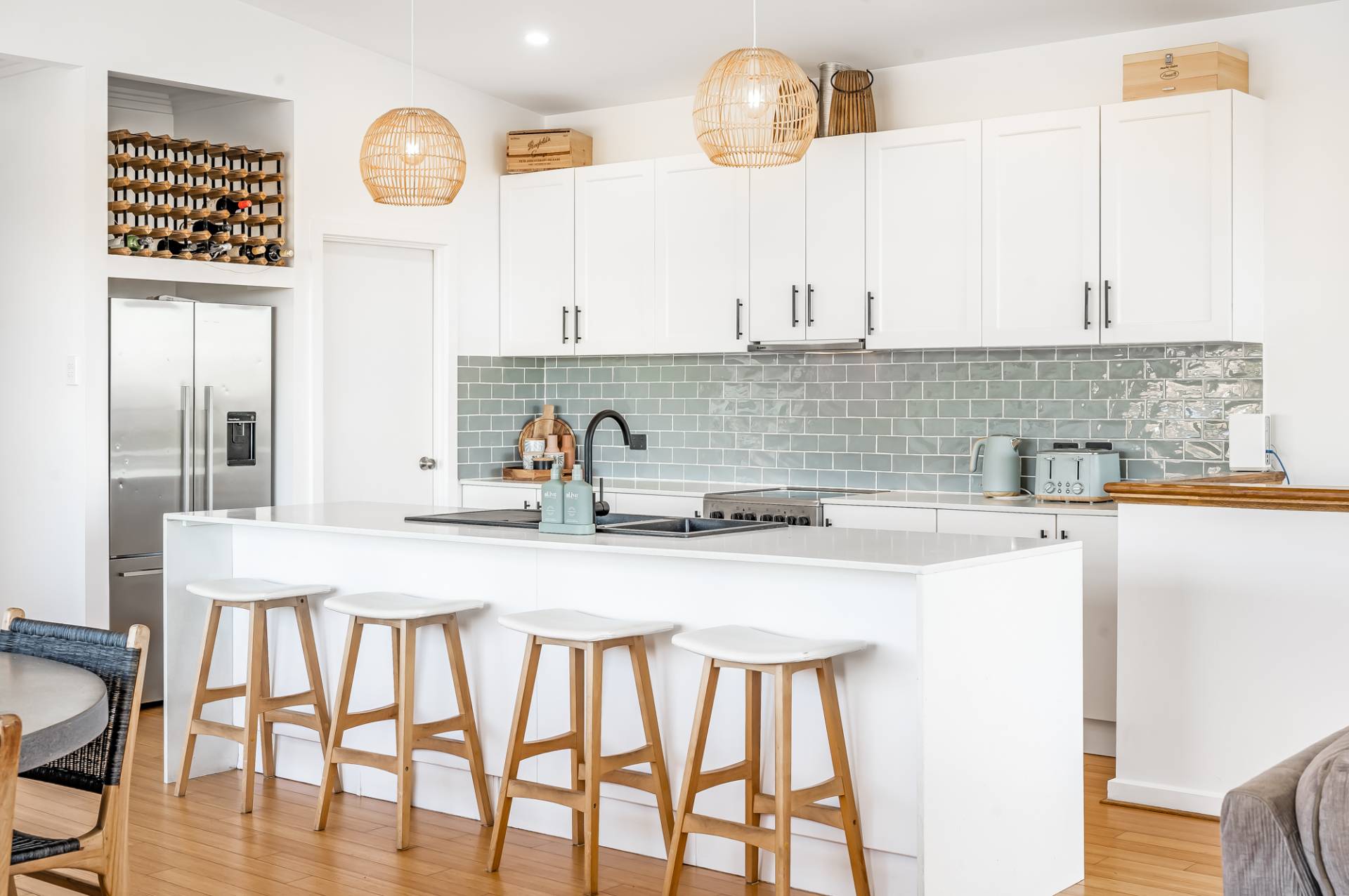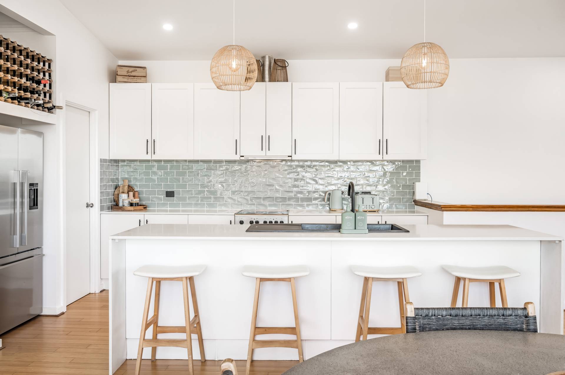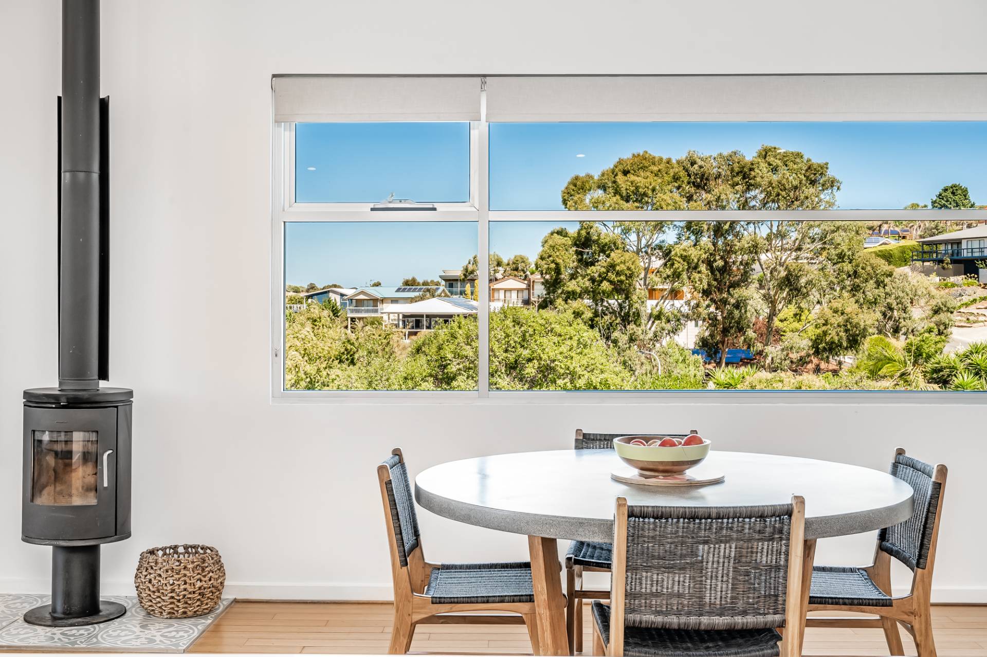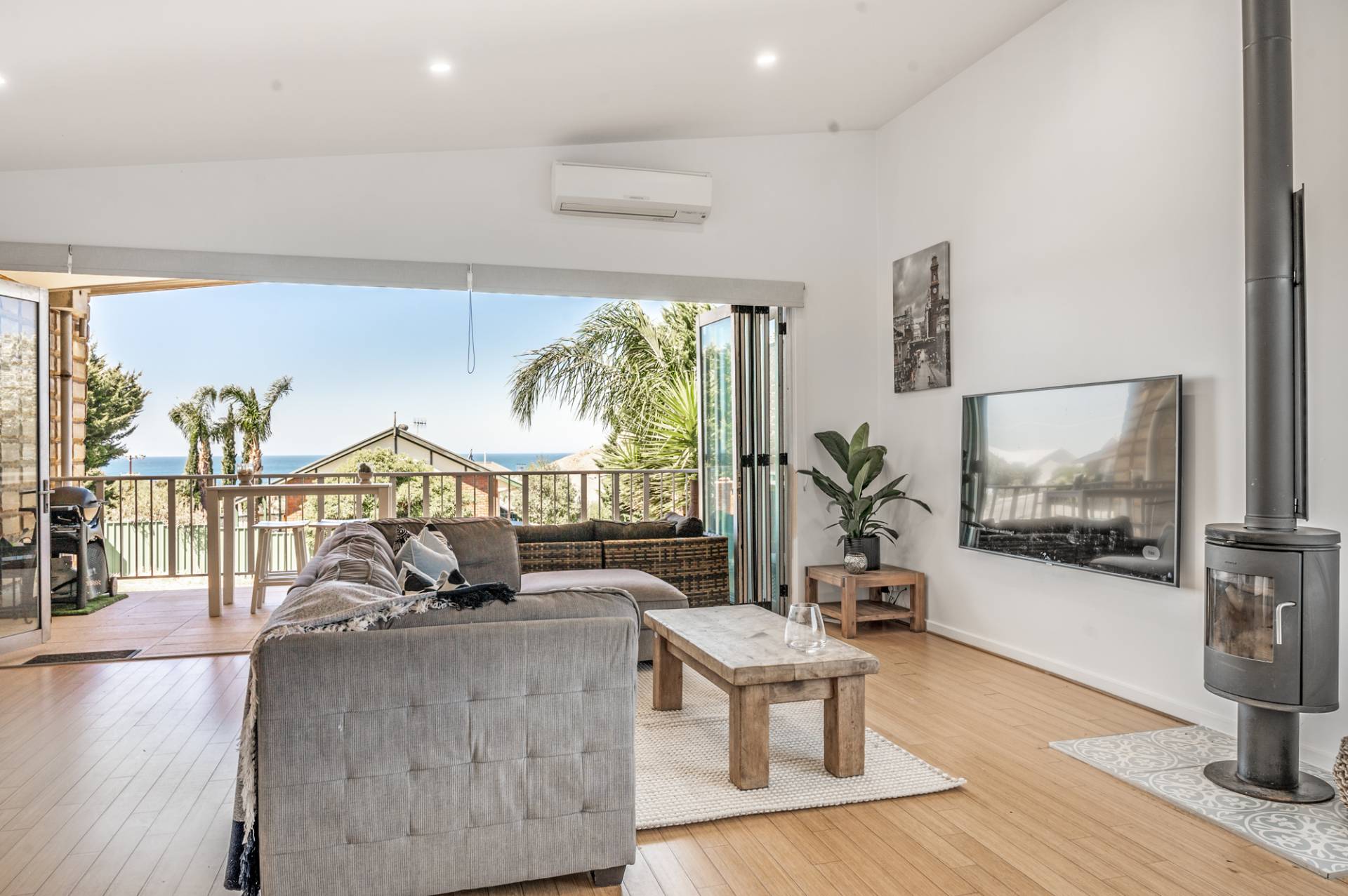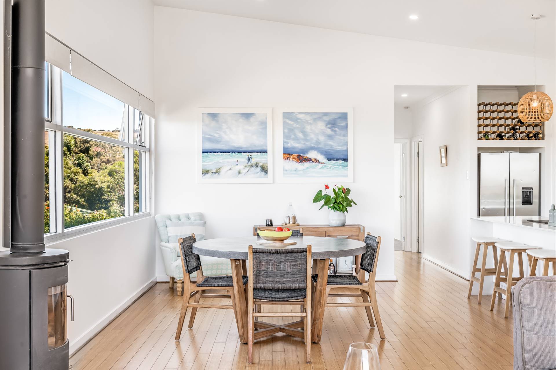 Set to a vaulted ceiling, the open and airy upper floor blends modern sophistication with a coastal-inspired elegance as this single, spectacular entertaining space moves from designer stone-topped chef’s zone to all-weather balcony and alfresco letting you indulge sunny days with friends, balmy evenings with chilled wine and even cosy winter nights with kids by the crackling combustion heater.